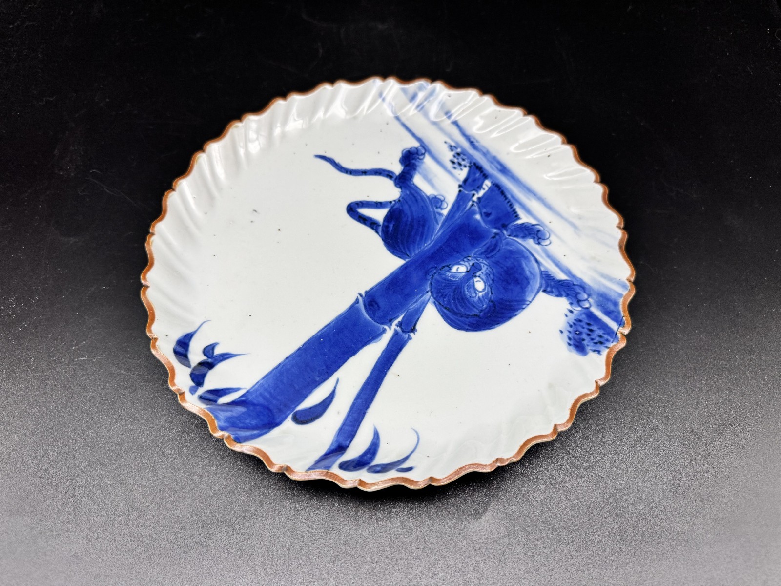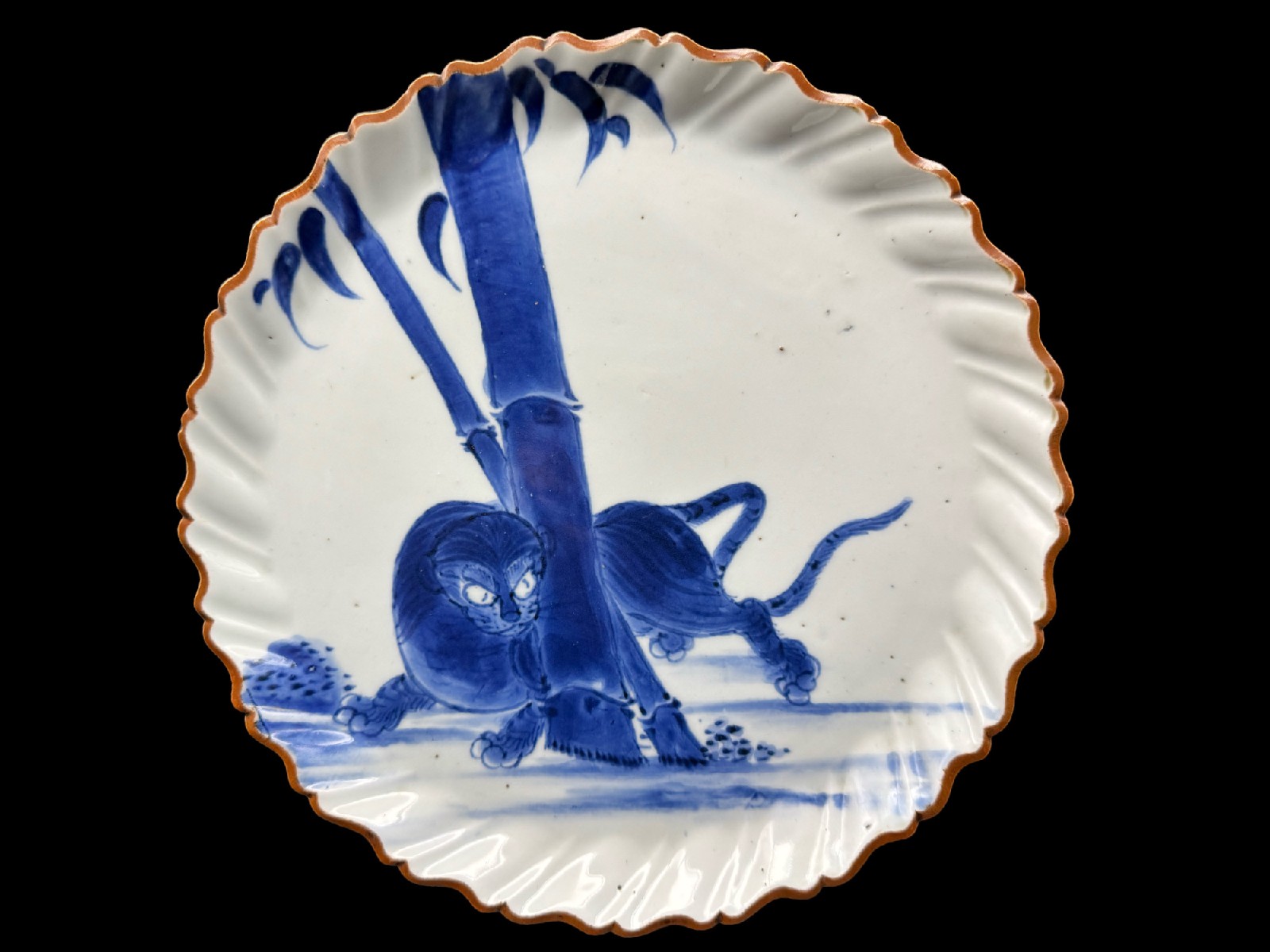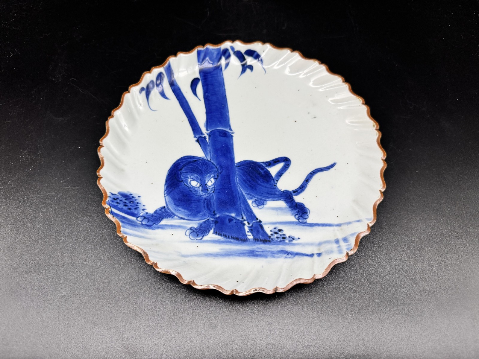 藍九谷 竹虎文捻輪花中皿