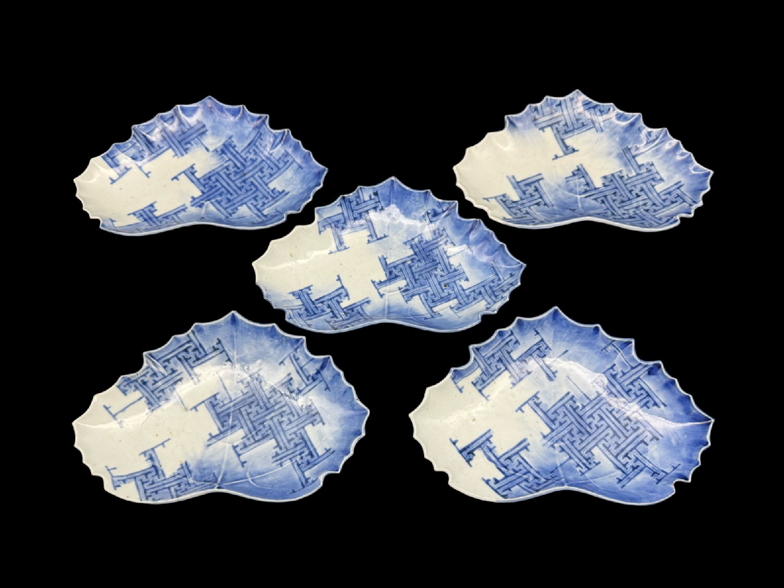 ご売約 藍九谷 紗綾形文葉形皿(5枚組)