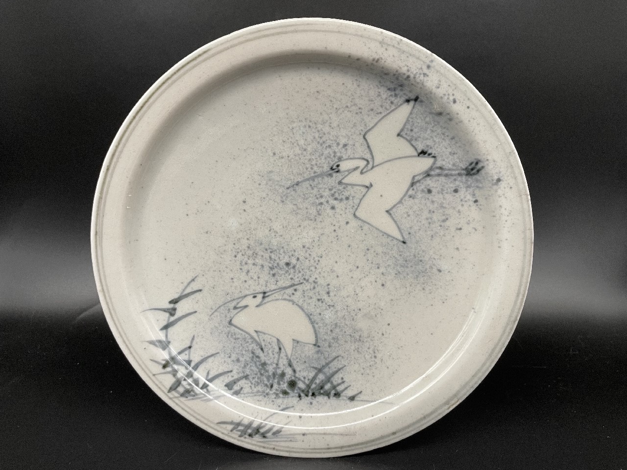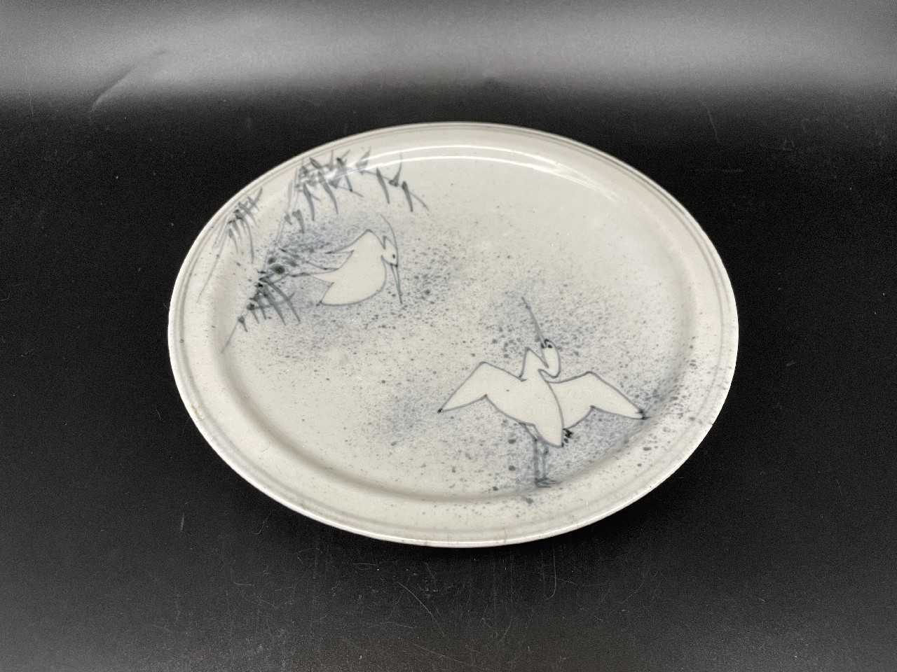 吹墨といえば雲兎、月兎、そして鷺ですが、鷺の吹墨は数が意外と少なく兎に比べると断然見る機会がありませんね。鷺が一羽だけ飛んでいるお皿、二羽ともに飛んでいるお皿、一羽だけ飛んで下の一羽が闊歩しているお皿と、だいたいこの3種類の紹介があるくらいです。