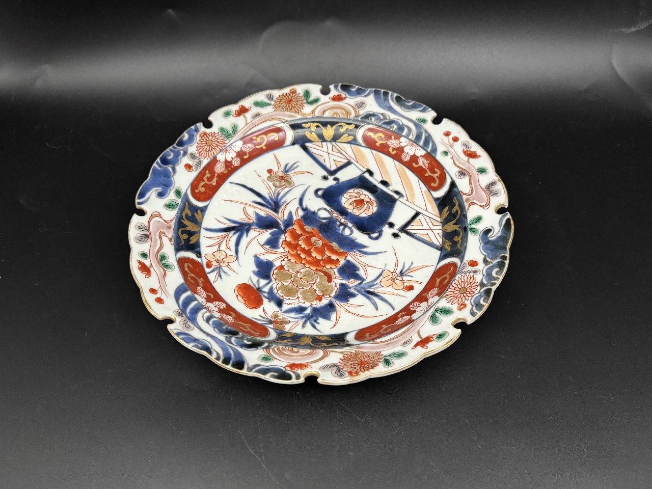 №28 古伊万里 色絵金彩 花籠文輪花中皿